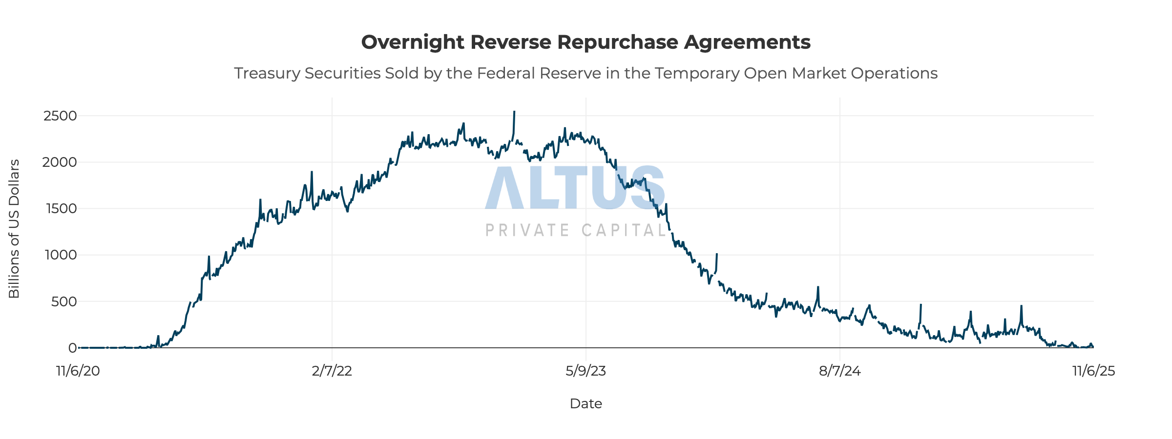 We can see confirmation of this shrinking liquidity in the balance of the Reverse Repo Facility, which unlike the Standing Repo Facility, pulls liquidity from markets when there is excess cash to stabilize growth. It came into heavy use after COVID stimulus, when trillions of dollars flooded the system and money market funds needed a safe place to park it. By lending that cash overnight to the Fed, they received Treasuries in return plus a small yield. At its peak, more than $2.5 trillion sat there.